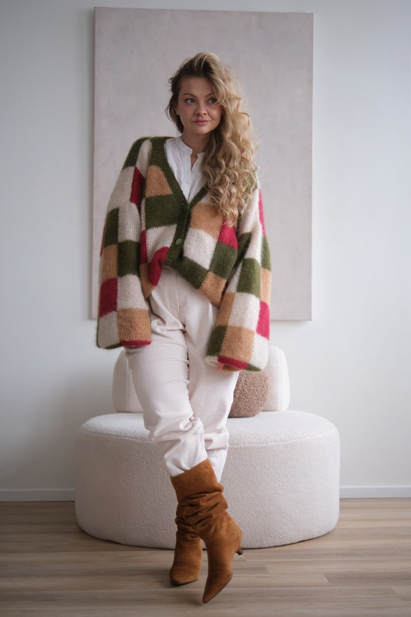 Największą rolę gra tutaj przepiękna krata. Wyjątkowe połączenie oliwki ecru karmelu i intensywnej czerwieni tworzy kompozycję, która idealnie wpisuje się w aktualne trendy. Dominuje oliwka dzięki czemu całość pozostaje spójna i elegancka z nutą odwagi.