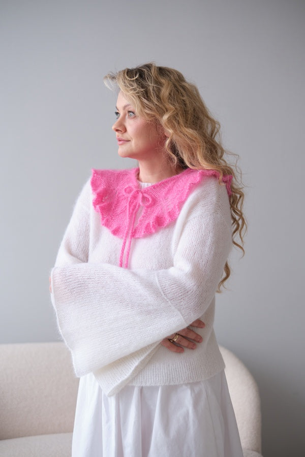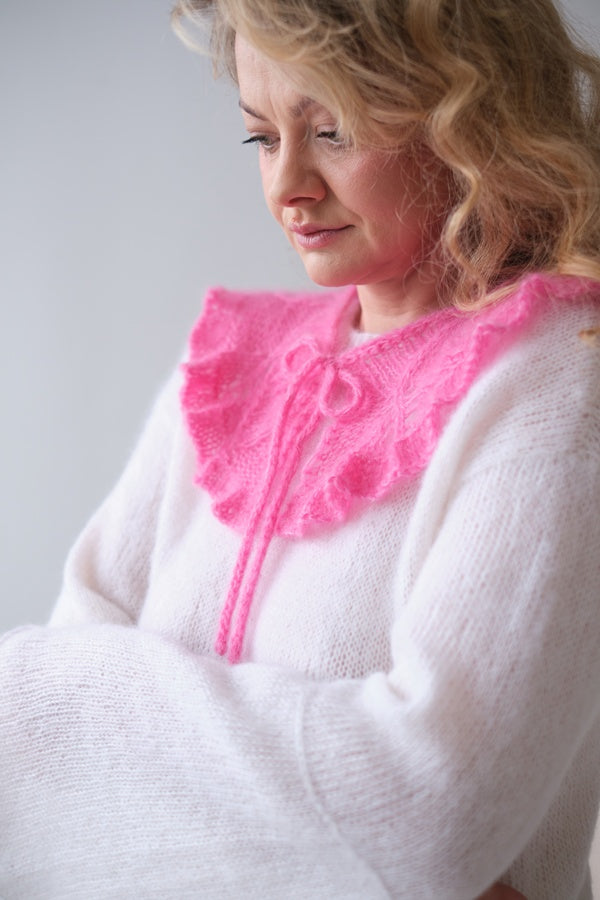 Ami to delikatny, wiązany kołnierzyk, który dodaje każdej stylizacji subtelnej finezji i kobiecego wdzięku. Wykonany z miękkiej przędzy, ozdobiony serduszkami, których kolor możesz wybrać wpisując preferencję w uwagach do zamówienia. Lekki dodatek, który zmienia look w kilka sekund i wprowadza romantyczny akcent do codziennego stroju.