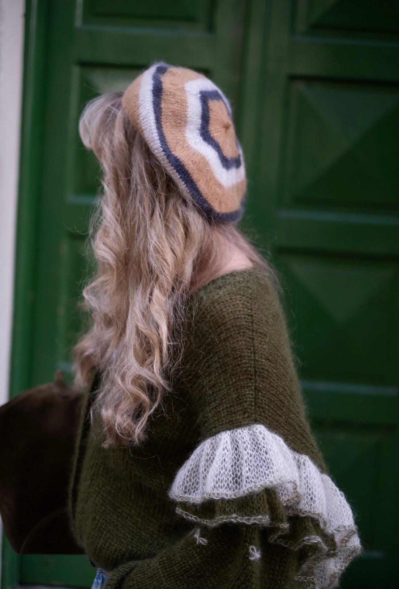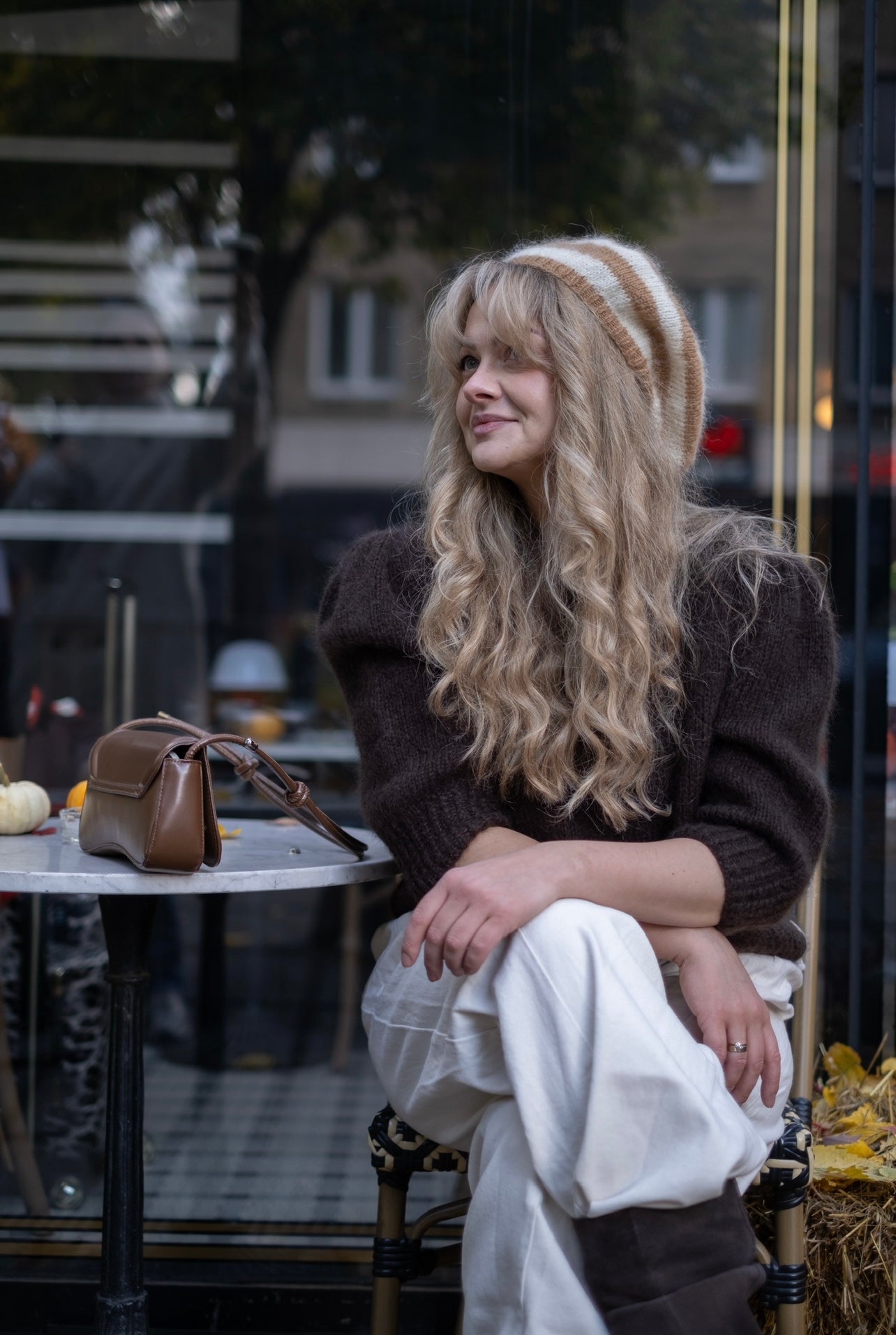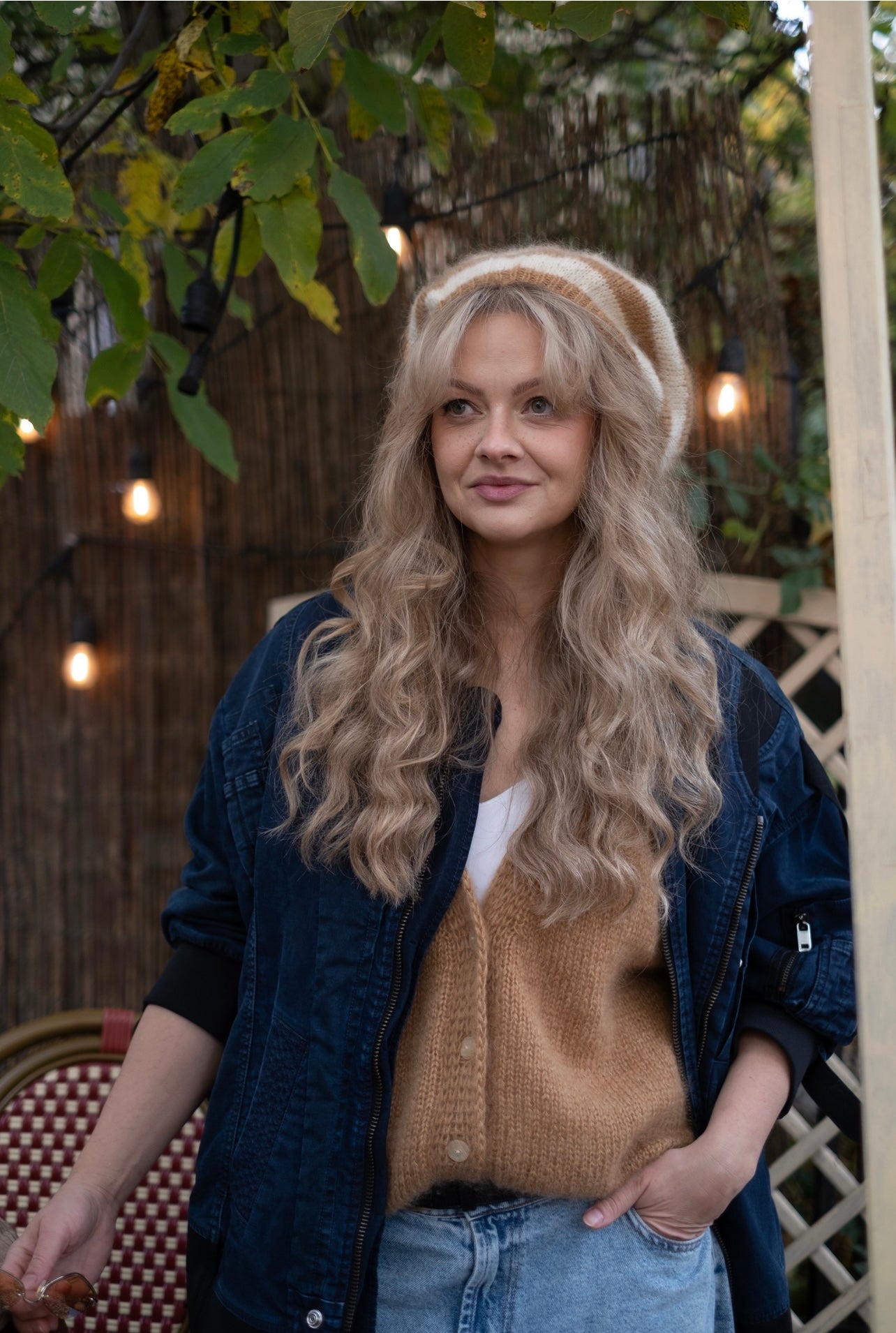 Beret Klementyna to siostra Ireny — równie miękka, równie kobieca, ale z odrobiną charakteru. Zaprojektowany w regularne pasy, które możesz skomponować w swoich ulubionych odcieniach, staje się dodatkiem nie tylko stylowym, ale i wyjątkowo osobistym.