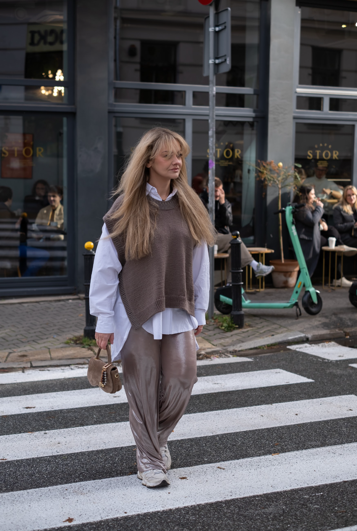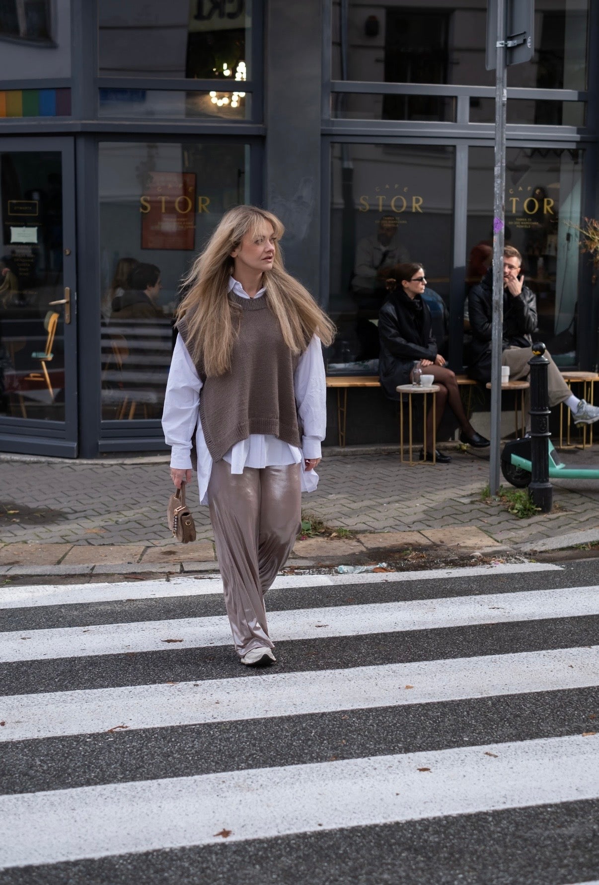 Są rzeczy które nie potrzebują mocnych słów by zachwycać. Wystarczy forma. Czysta miękkość. Subtelny blask który porusza w ruchu. Taka jest kamizelka Lidia. Prosta i nowoczesna a jednocześnie pełna lekkości, która sprawia że staje się Twoją drugą skórą.