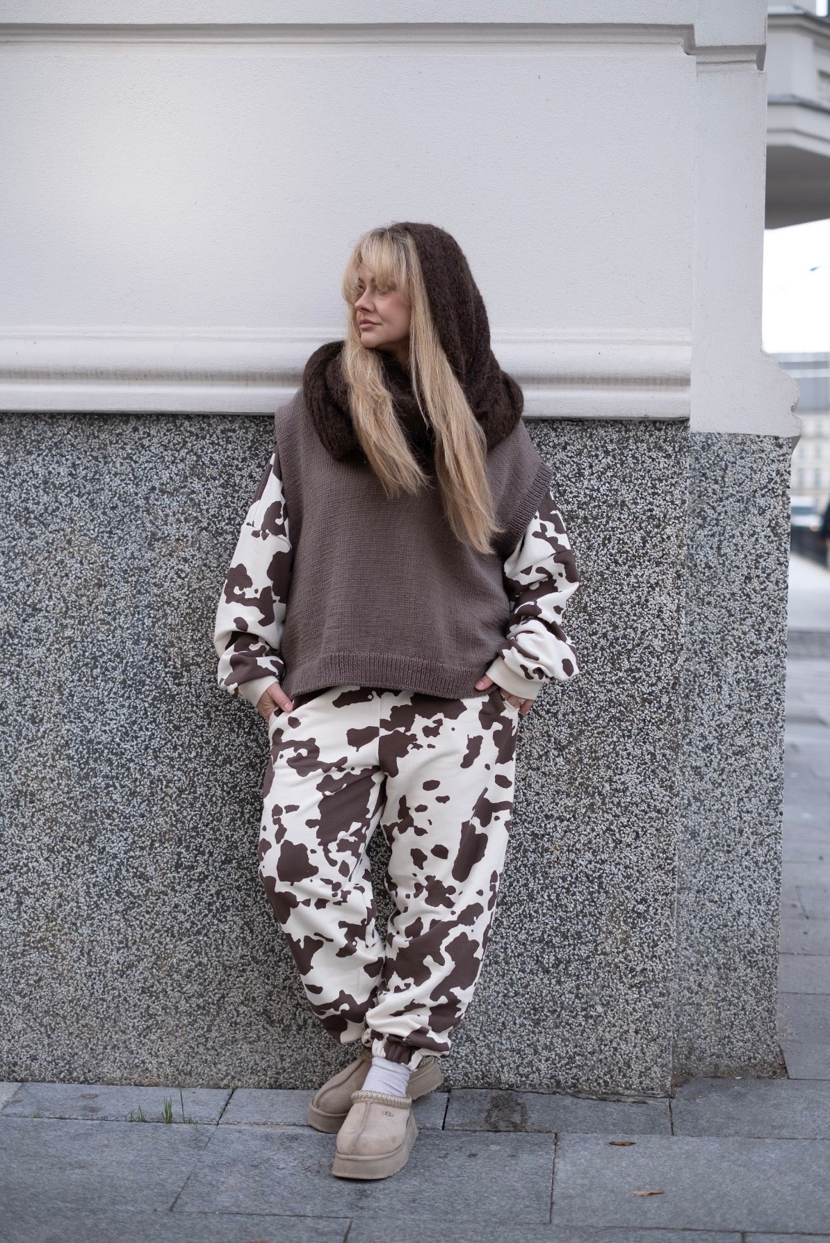 Jej krój opiera się na minimalistycznej harmonii. Tył jest nieco dłuższy, przód delikatnie krótszy dzięki czemu sylwetka zyskuje lekkość i efekt pływającego materiału. Po bokach znajdują się guziki, które pozwalają Ci nosić ją na dwa sposoby. Jako swobodną kamizelkę lub jak poncho, które miękko układa się wokół ciała.
