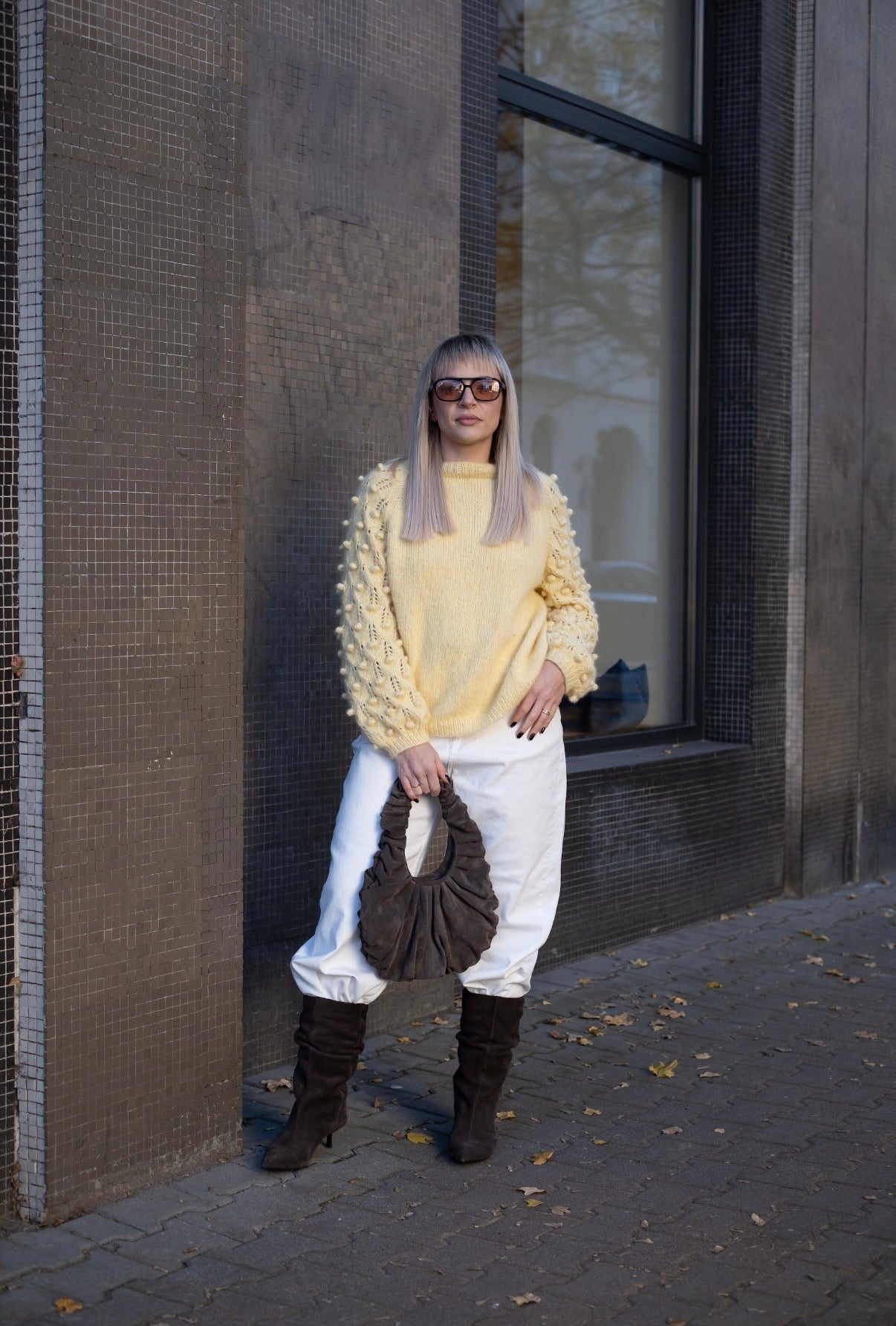 Przód i tył są gładkie niczym płótno, ale to rękawy tworzą całą historię. Połączenie bąbli i liści wygląda absolutnie obłędnie. Rękaw jest prosty lecz jednocześnie bardzo dekoracyjny dzięki czemu Zoya staje się swetrem, którego nie sposób pomylić z żadnym innym.